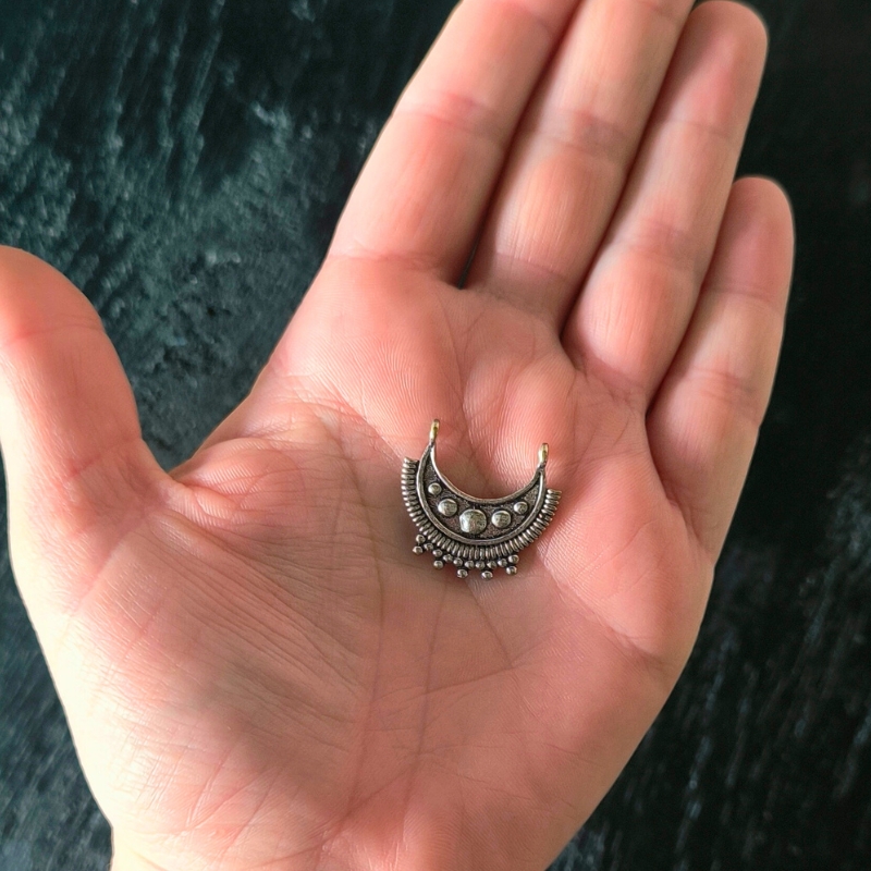 Connecteur lune tribal est disponible en laiton doré ou argenté.